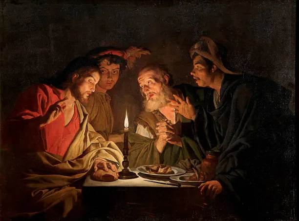 W pierwszy dzień tygodnia dwaj uczniowie Jezusa byli w drodze do wsi, zwanej Emaus, oddalonej sześćdziesiąt stadiów od Jerozolimy. Rozmawiali oni z sobą o tym wszystkim, co się wydarzyło. Gdy tak rozmawiali i rozprawiali z sobą, sam Jezus przybliżył się i szedł z nimi. Lecz oczy ich były niejako na uwięzi, tak że Go nie poznali. On zaś ich zapytał: Cóż to za rozmowy prowadzicie z sobą w drodze? Zatrzymali się smutni. A jeden z nich, imieniem Kleofas, odpowiedział Mu: Ty jesteś chyba jedynym z przebywających w Jerozolimie, który nie wie, co się tam w tych dniach stało. Zapytał ich: Cóż takiego? Odpowiedzieli Mu: To, co się stało z Jezusem Nazarejczykiem, który był prorokiem potężnym w czynie i słowie wobec Boga i całego ludu; jak arcykapłani i nasi przywódcy wydali Go na śmierć i ukrzyżowali. A myśmy się spodziewali, że On właśnie miał wyzwolić Izraela. Tak, a po tym wszystkim dziś już trzeci dzień, jak się to stało. Nadto jeszcze niektóre z naszych kobiet przeraziły nas: były rano u grobu, a nie znalazłszy Jego ciała, wróciły i opowiedziały, że miały widzenie aniołów, którzy zapewniają, iż On żyje. Poszli niektórzy z naszych do grobu i zastali wszystko tak, jak kobiety opowiadały, ale Jego nie widzieli. Na to On rzekł do nich: O nierozumni, jak nieskore są wasze serca do wierzenia we wszystko, co powiedzieli prorocy! Czyż Mesjasz nie miał tego cierpieć, aby wejść do swej chwały? I zaczynając od Mojżesza poprzez wszystkich proroków wykładał im, co we wszystkich Pismach odnosiło się do Niego. Tak przybliżyli się do wsi, do której zdążali, a On okazywał, jakoby miał iść dalej. Lecz przymusili Go, mówiąc: Zostań z nami, gdyż ma się ku wieczorowi i dzień się już nachylił. Wszedł więc, aby zostać z nimi. Gdy zajął z nimi miejsce u stołu, wziął chleb, odmówił błogosławieństwo, połamał go i dawał im. Wtedy oczy im się otworzyły i poznali Go, lecz On zniknął im z oczu. I mówili nawzajem do siebie: Czy serce nie pałało w nas, kiedy rozmawiał z nami w drodze i Pisma nam wyjaśniał?